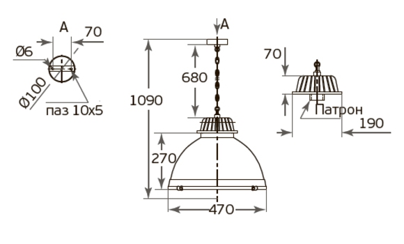 Модель представляют модификации с керамическим патроном Е27 и Е40, в который устанавливается ртутная или компактная люминесцентная лампа. Кроме этого, версии отличаются наличием или отсутствием защитного стекла, плотность прилегания которого обеспечена силиконовой прокладкой. В состав изделия входит куполообразный (Ø 470 мм) анодированный и отполированный отражатель. Тип КСС – полуширокая.