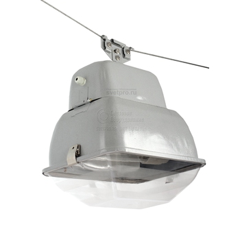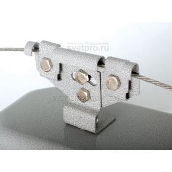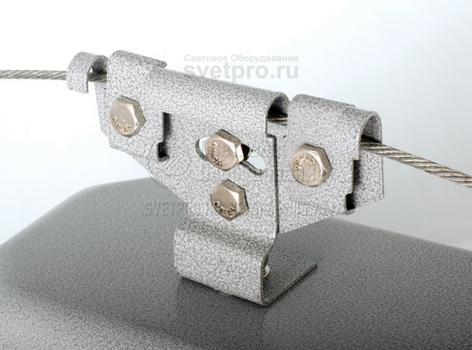 Осветительный прибор подвешивается на натянутый трос. Узел крепления позволяет поворачивать изделие для изменения положения оптической части.