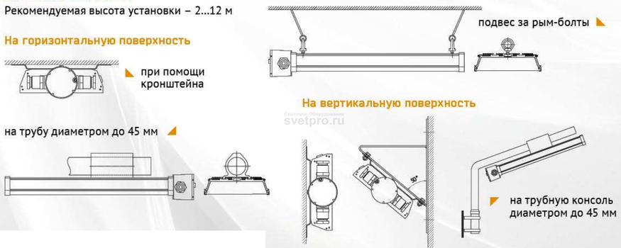 Выбор способа монтажа отражается на заказе соответствующего крепежного приспособления: комплекта кронштейнов или рым-болтов. Доступна индивидуальная установка (кабельный ввод и пробка-заглушка – элементы комплектации) и транзитное подключение, требующее дополнительных кабельных вводов.