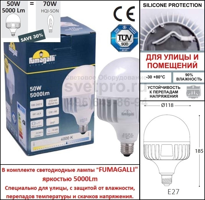 | Комплектация: | С светодиодной лампой "FUMAGALLI" E27 HIGH POWER LED 50W. Специально для улицы, яркость 5000 Lm. С защитой от перепадов температуры, повышенной влажности и скачков напряжения. |
