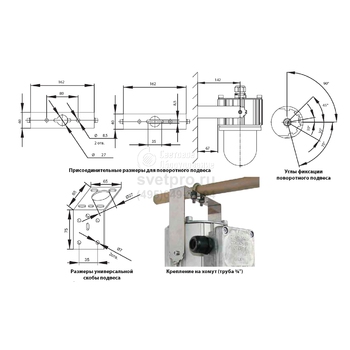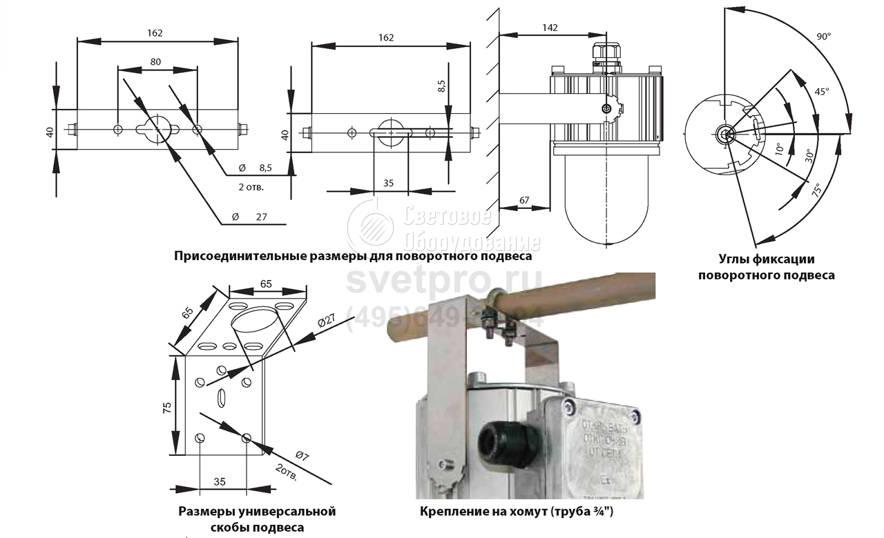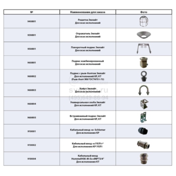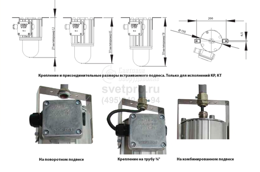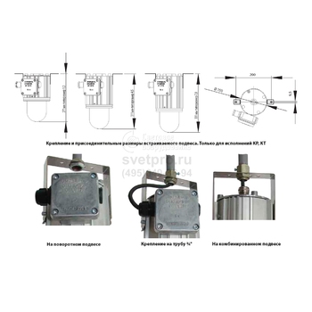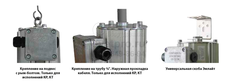 Монтаж осуществляется с использованием основного и дополнительного комплекта поставки: поворотный, встраиваемый и комбинированный подвес, хомут и рым-болт, скоба. В модельном ряду представлены изделия с вводной коробкой и прямым вводом кабеля, устанавливаемые транзитным или тупиковым вариантом.