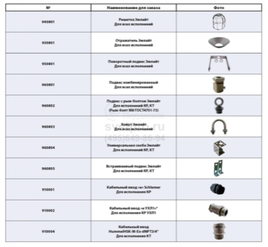 В корпусе светильника предусмотрен один из видов патрона: винтовой, штырьковый, фланцевый, предопределяющий разновидность источника света (ДРИ, ДНаТ, ЛОН, КЛЛ, автолампа) и его мощность: 26–100 Вт. Электропитание модификаций: от источника постоянного тока: 12 и 24 В (автобазирование) и стандартной сети (общее освещение). Версии с ДРИ, оснащенные ЭПРА, отмечены индексом Э. Значение температуры воздуха, при которой соблюдается корректная работа изделия, составляет: -20 (-45; -60)°С – +40°С.