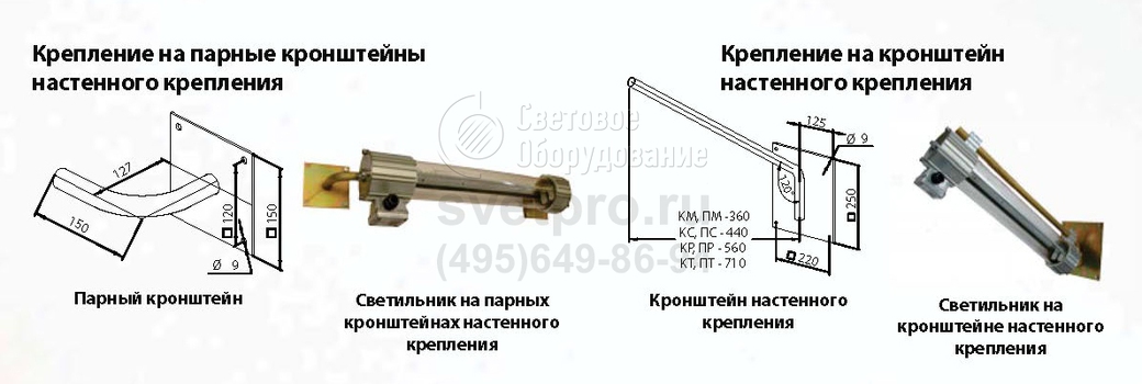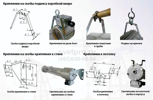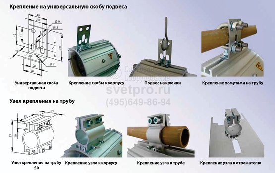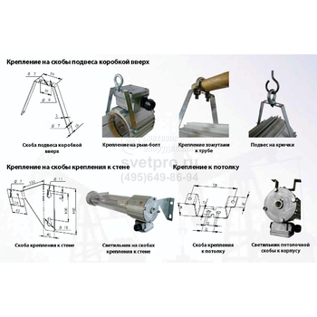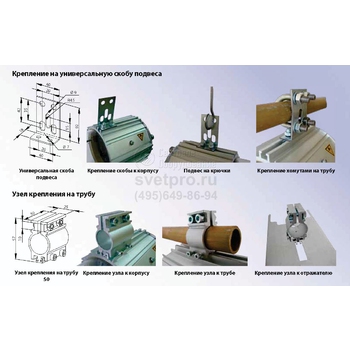Cветильник поставляется с двумя универсальными скобами подвеса без решётки и отражателя, с одним кабельным вводом для тупикового монтажа.