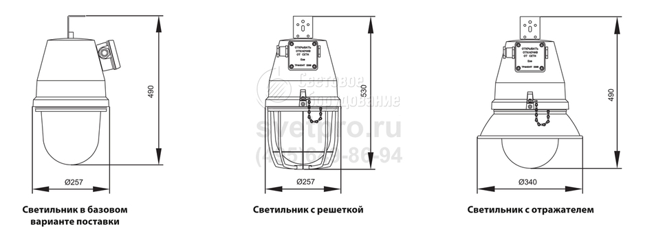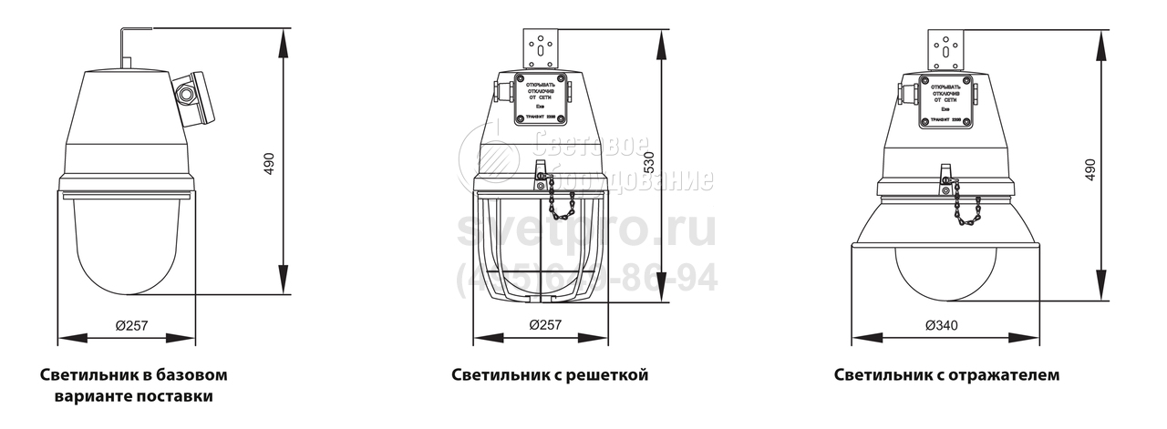 В базовом варианте светильник поставляется с одним кабельным вводом и одной пробкой для тупикового монтажа, с универсальной скобой подвеса, без решётки и без отражателя.
