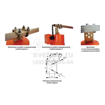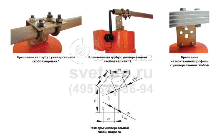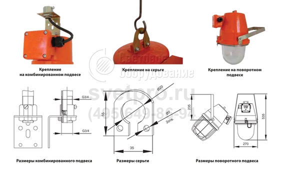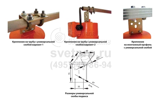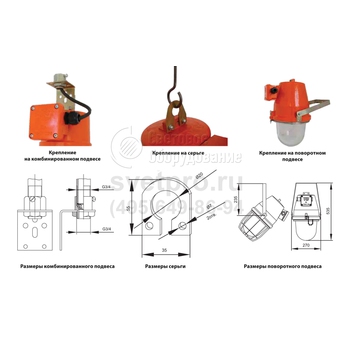 Подвесной монтаж (транзитный или тупиковый) на трубу, профиль, рым-болт осуществляется с использованием крепежа, предусмотренного в базовой или дополнительной комплектации. Подключение кабеля осуществляется во вводной коробке, установленной на корпусе.
