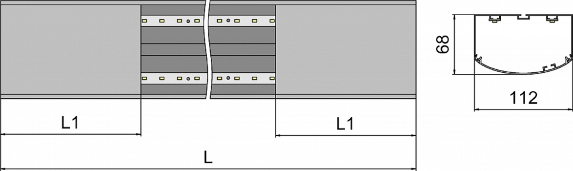 Модульный светодиодный светильник прямоугольного поперечного сечения с овальной крышкой. Корпус светильника изготовлен из алюминиевого профиля.