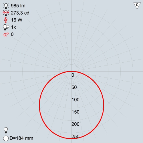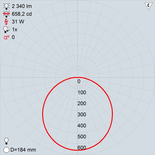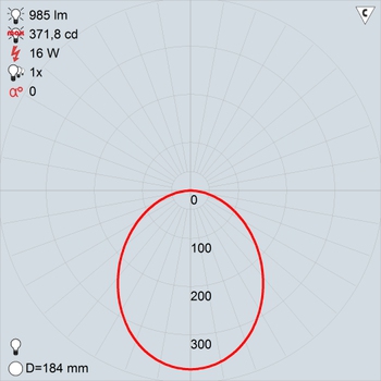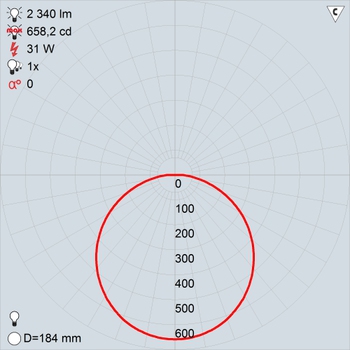 Светодиодная матрица излучает 985 и 2340 лм. Значение определяет потребленная мощность, которая в модификациях равна: 16 и 31 Вт, а также световая отдача LED – 62 и 75 лм/Вт. Направленный поток света, не содержащий УФ и ИК составляющих, распределяется в очень широком угле (Very Wide Flood). Слепящее действие предотвращает опаловый рассеиватель. Изделию свойственна хорошая цветопередача Ra80, длительный эксплуатационный ресурс (40 000 час), теплый цветовой оттенок (3000 К) белого света. Модификации предусматривают иную цветовую температуру: 2700 К, 4000 К. Исключены визуальные пульсации света.