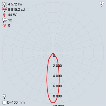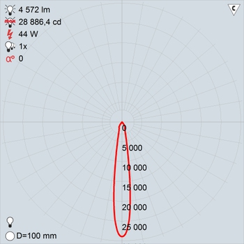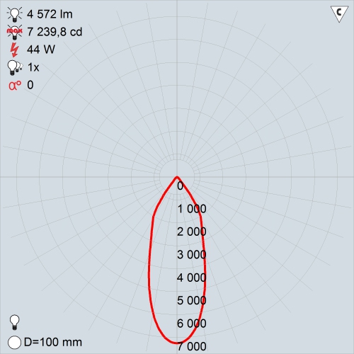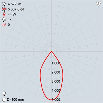 Потребляя 39 Вт, модификации светильника создают световой поток 3794 и 4572 лм. Значения корректны при использовании матриц с теплым белым светом (3000 К). Доступны другие значения цветовой температуры. Излучаемому свету характерна хорошая цветопередача – Ra80 и Ra90. Отражатель формирует направленный поток света, минимизируя его потери и эффект блесткости. Модификации изделия создают яркое пятно (Spot), узкий, средний и широкий поток. Наличие драйвера поддерживает длительную работоспособность модели (50 000 час.) и обеспечивает условия для управления по аналоговому протоколу DALI.