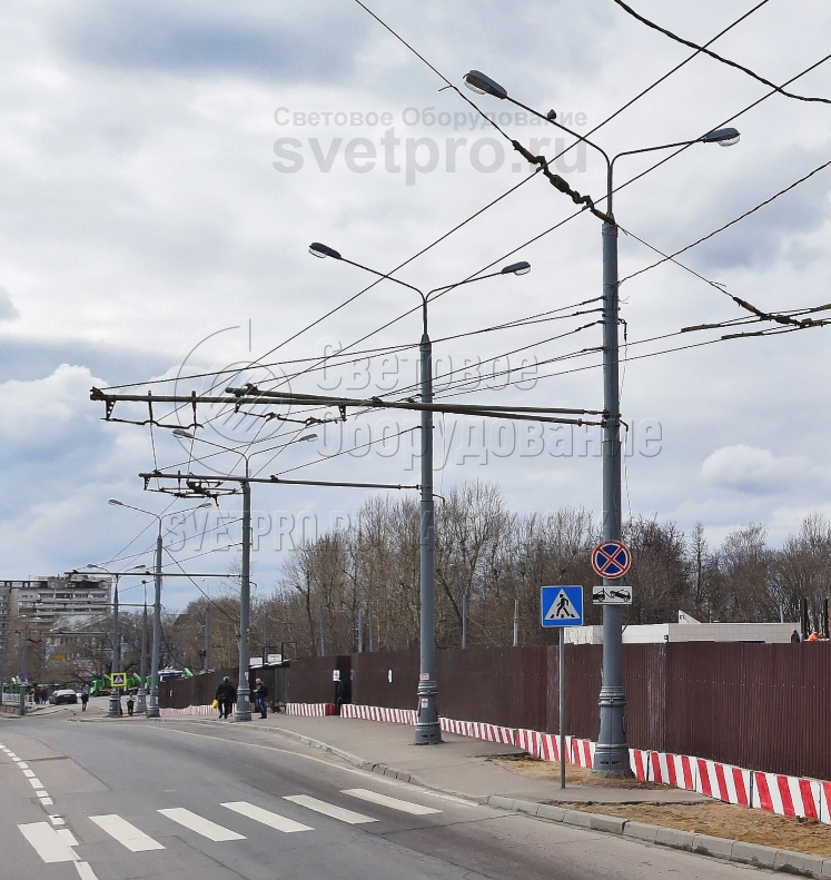 Монтаж опорных девятиметровых столбов выполняется на бетонное основание с размещенным внутри закладным элементом. Соединение опоры и закладной детали осуществляется при помощи фланца.