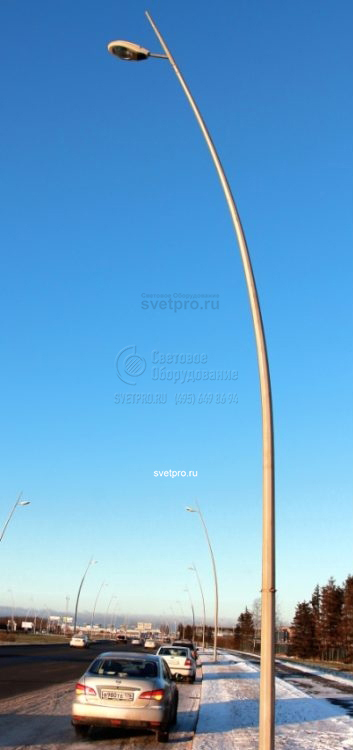 Главная особенность опор этого типа — корпус в виде конуса, который изогнут в сторону дороги под небольшим радиусом. Это делает дизайн конструкции необычным и позволяет разместить центр светового пятна дальше от центральной оси ствола.