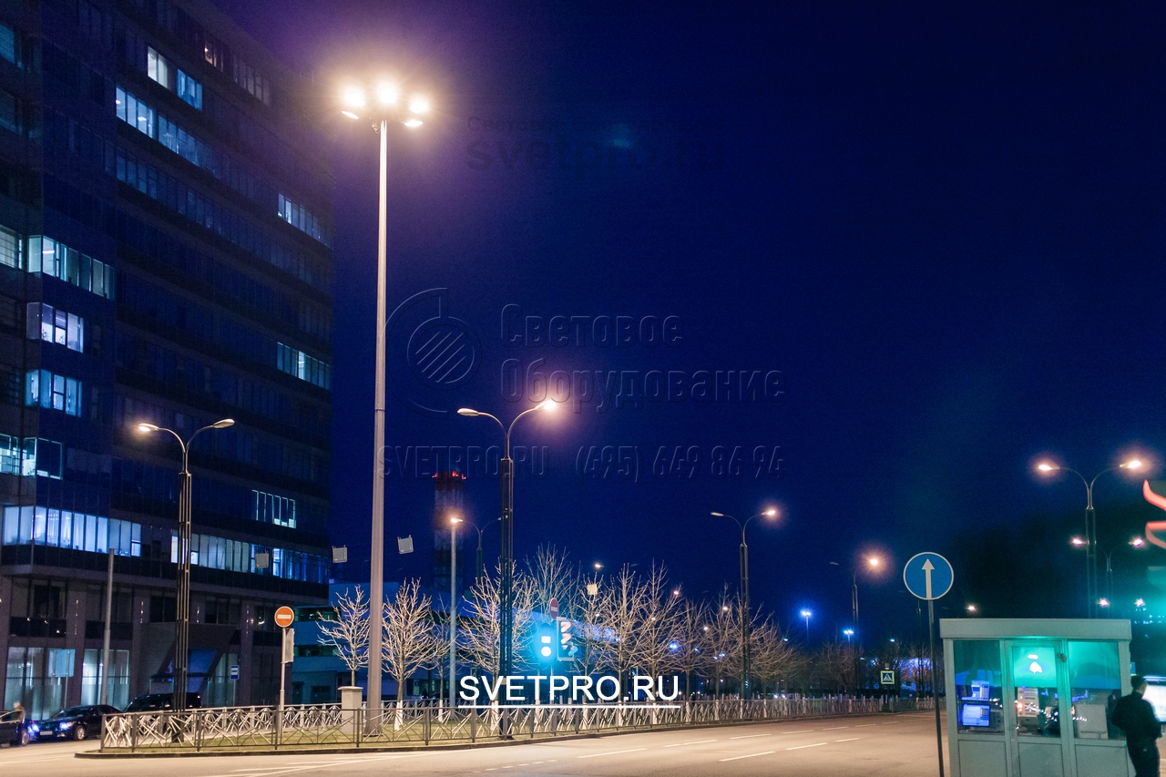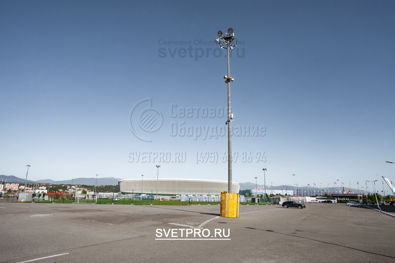 Равномерность освещения больших открытых территорий, обеспечивается с применением прожекторных мачт, высотой до 40 м, со стационарной рамой различной формы. Ствол мачты образован из 2-х – 4-х секций, изготовленных из стального листового проката, которому при изгибе придана конусная граненая форма. Кромки соединены сварочным швом, антикоррозионная защита выполнена горячим цинкованием. Обслуживание прожекторов производится в зависимости от модификации мачты – с площадки и лестницы, ведущей к ней, установленных на мачте, либо при их отсутствии – с помощью высотной спецтехники. Мачты устанавливаются фланцевым способом, тип закладной детали – анкерный.