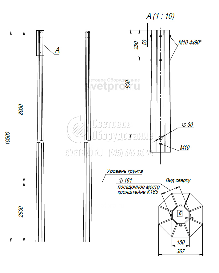 Тип | Р, кг | Н, м | Н1, м | D1, мм | D2, мм | h, м | Посадочное место кронштейна | Масса, кг |