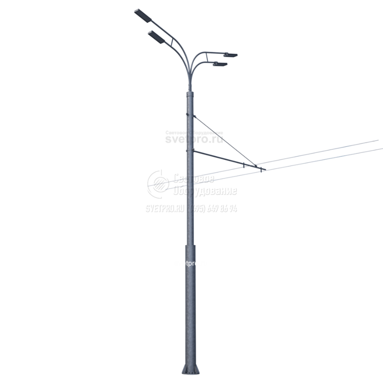ОКСТф - опоры контактной сети трубчатые фланцевые совмещают в себе функцию поддерживающих устройств питающей линии контактной сети и элементов наружного освещения. В связи с этим опоры воспринимают большие нагрузки в сравнении с силовыми опорами, предназначенными исключительно для освещения, а также должны обладать большей жесткостью (отклонение под действием нагрузки не более 1/70 высоты опоры) для сохранения работоспособности контактной сети при различных климатических условиях. Трубчатые силовые опоры контактной сети изготавливаются двухсоставными с поперечным сварным стыком в центральной части стойки из стальных труб. В верхней части опоры выполнено отверстие для возможности ввода питающего кабеля к светильнику.
