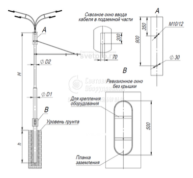 Тип | Н, м | D1, мм | D2, мм | А/B, мм | d, мм | n, шт | Посадочное место кронштейна | Масса, кг |