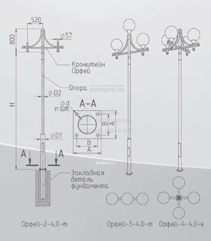 Итоговая высота складывается из высоты опоры и высоты кронштейна (указана в таблице).