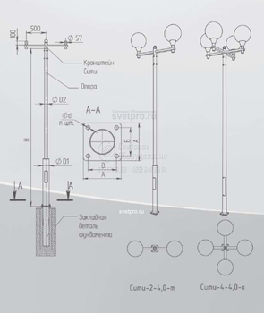 Итоговая высота складывается из высоты опоры и высоты кронштейна (указана в таблице).