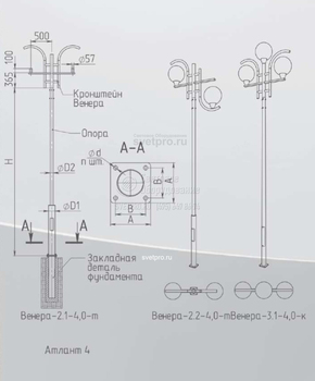 Итоговая высота складывается из высоты опоры и высоты кронштейна (указана в таблице).