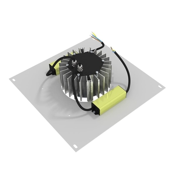С целью сохранения параметров светильника по высоте источник питания закрепляется на основании из алюминия около основного корпуса.
