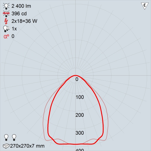 ЭПРА находится за пределами корпуса, но связан с источником света питающим кабелем. Световой поток, излучаемый двумя КЛЛ (18 или 26 Вт), распределяется под воздействием отражателя. При этом обеспечивается формирование защитного угла светильника. Слепящее воздействие света исключает матовый рассеиватель – плоское стекло, установленное в декоративную рамку. Рамка закрывает контур области встраивания. Пульсации светового потока, составляющего 2400 или 3600 лм, составляют менее 3%. Имеется версия с блоком аварийного питания.