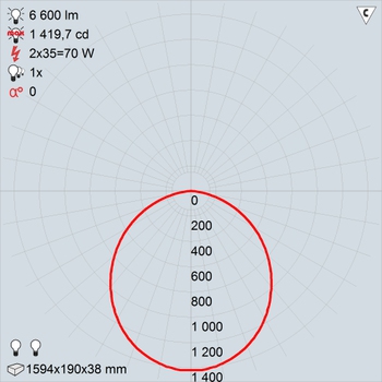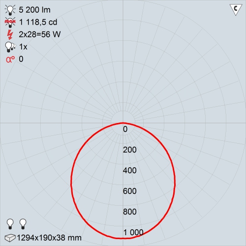 В корпусе светильника установлен ЭПРА, поддерживающий работоспособность ламп Т5. В версиях изделия предусмотрено применение 2-х источников света, мощностью 28 или 35 Вт. Потери потребляемой мощности не превышают 4%. Пульсации света, составляющие менее 5%, не воспринимаются визуально. Рассеивание света обеспечено наличием опалового рассеивателя. Световой поток в количестве 5200 или 6600 лм распределяется по КСС косинусного типа. Качество света можно улучшить, обеспечив дополнительно формирование отраженного светового потока. Для реализации цели предусмотрен аксессуар – верхний рассеиватель.