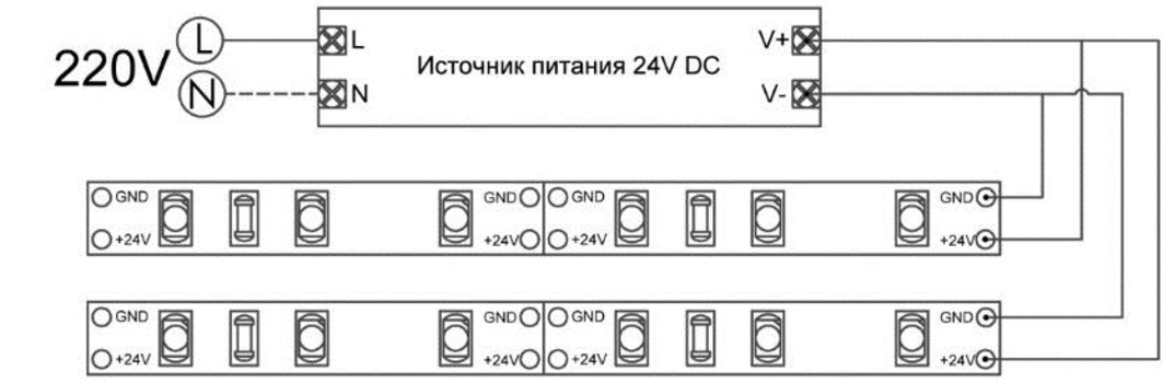 Схема подключения светодиодной ленты к источнику питания