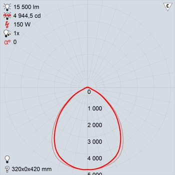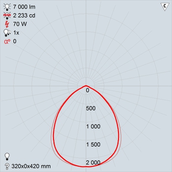 В корпусе изделия установлен ЭПРА и патрон для металлогалогенной лампы со штырьковым цоколем G12 мощностью 70 или 150 Вт. Активно расходуемая мощность составляет не менее 95% от общего объема потребленной электроэнергии. Пульсации светового потока (7000 и 15500 лм) – менее 5%. Глубокий тип светораспределения обеспечен наличием отражателя. Положение лампы и форма оптического элемента позволяют формировать защитный угол светильника. Защитную функцию выполняет темперированное стекло.