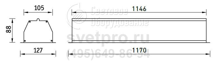Встраиваемая часть корпуса одиночного светильника имеет размер: 1146х105х88 мм. Наружный формат рамки, в которую вставлен рассеиватель: 1170х127 мм. Окрашивание металлических частей выполняется порошковым методом. Обретаемый цвет: белый или металлик.