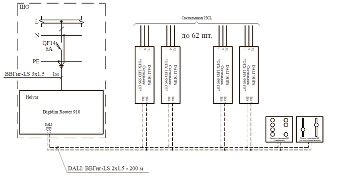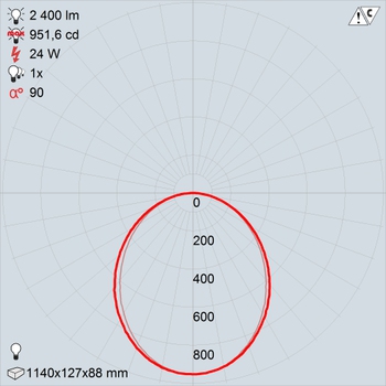 Мощность светодиодных кластеров, установленных в светильнике, составляет 28 Вт. Интенсивный световой поток, на образование которого расходуется не менее 90% потребляемой электроэнергии, равен 2360 лм. Для обеспечения диффузного светораспределения применен опаловый рассеиватель. Интенсивность света можно изменять посредством диммируемого драйвера. Управляющий протокол – DALI. Доступность изменения цветовой температуры света (2800К – 5800К) становится реальной, при подключении к управляющей системе. Для ее комплектации в состав аксессуаров входят роутеры и модули (ползунковый и кнопочный).