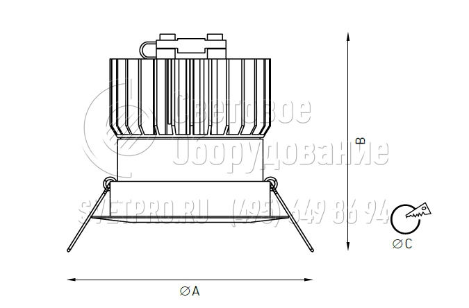 Модель встраивается в потолочную конструкцию. Вырез зависит от диаметра выбранной модификации. Фиксацию обеспечивают монтажные клипсы.