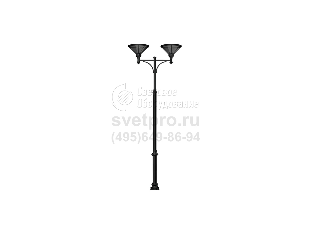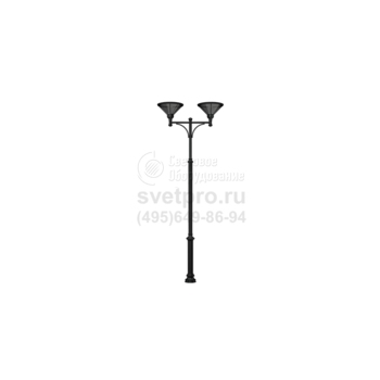 Составной ствол опоры образуют отрезки труб диаметром: 159, 102 и 76 мм. Состыковка выполнена сварочным швом и дополнена декорированным элементом. Изделие имеет версию для непосредственной установки венчающего светильника. В данном варианте высота конструкции – 4220 мм. Второй конструктивный вариант, высотой 4390 мм дополнен переходниками, позволяющими выполнить установку 2-х осветительных приборов. Кабель вводится подземным способом через окна закладного элемента. В нижней секции расположен лючок для обслуживания.