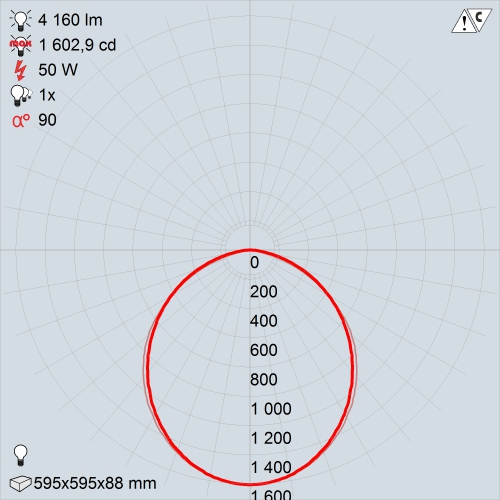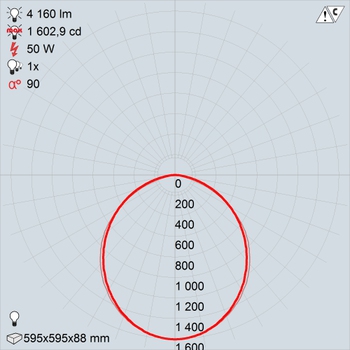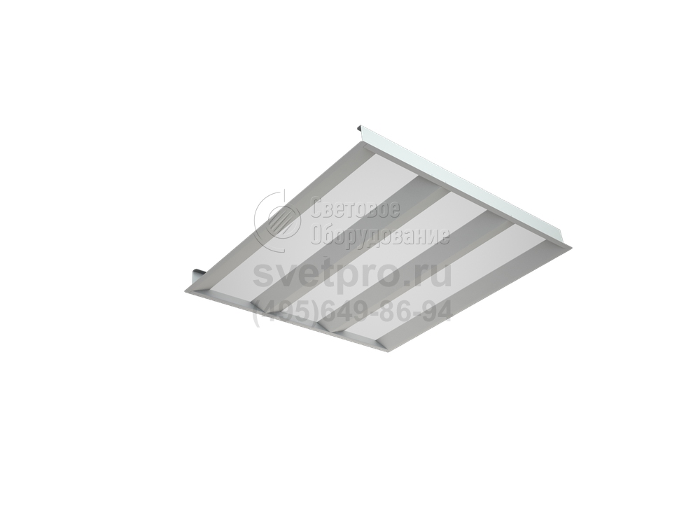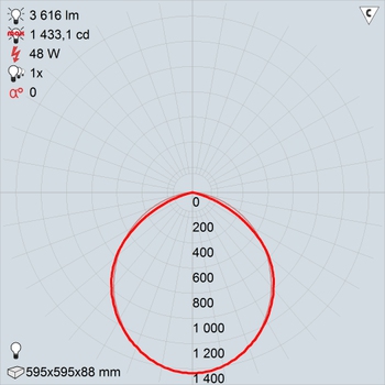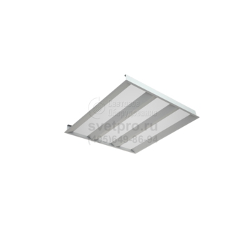 В каждой модификации установлен драйвер и источник света в виде линейных светодиодных модулей, мощностью 36 Вт. Имея одинаковый габаритный формат 595х595 мм, версии светильника отличаются количеством модулей: 2 и 3, что ведет к наличию 2-х или 3-х оптических элементов, исключающих ослепление светом. Разграничивающие части – светонепроницаемые. Световой поток, распределение которого описывает КСС косинусного типа, равен 4200 и 3600 лм. Разнообразие в выбор приоритетного изделия вносит цветовой оттенок света (теплый или нейтральный), а также доступность автономной работы при сбое основного питания. Продолжительность цикла излучения света одним модулем (15% от номинала) при комплектации БАП – 1 час.