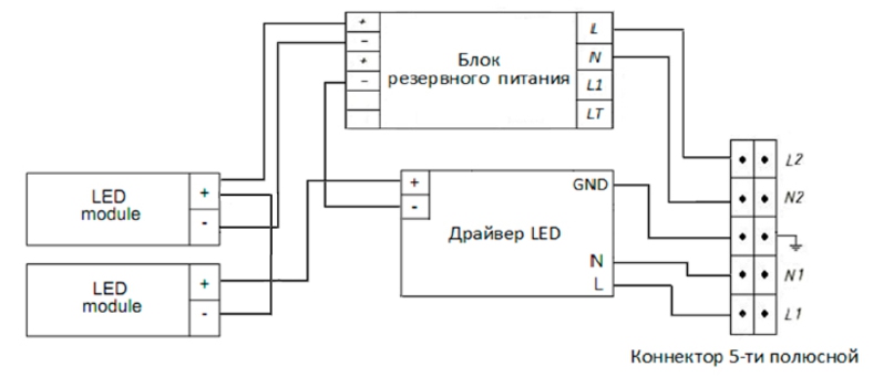 Светильник обеспечивает работу одного LED module при аварийном отключении питающего напряжения. Батарея поддерживает работу LED module не менее 1 часа в данном режиме. Световой поток LED module при этом составляет 15% от номинального.