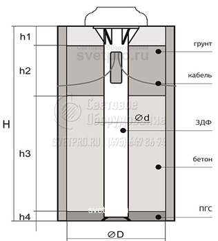 | D | H | d | h1 | h2 | h3 | h4 | Ориентировочная масса | бетон | гравий | грунт | |