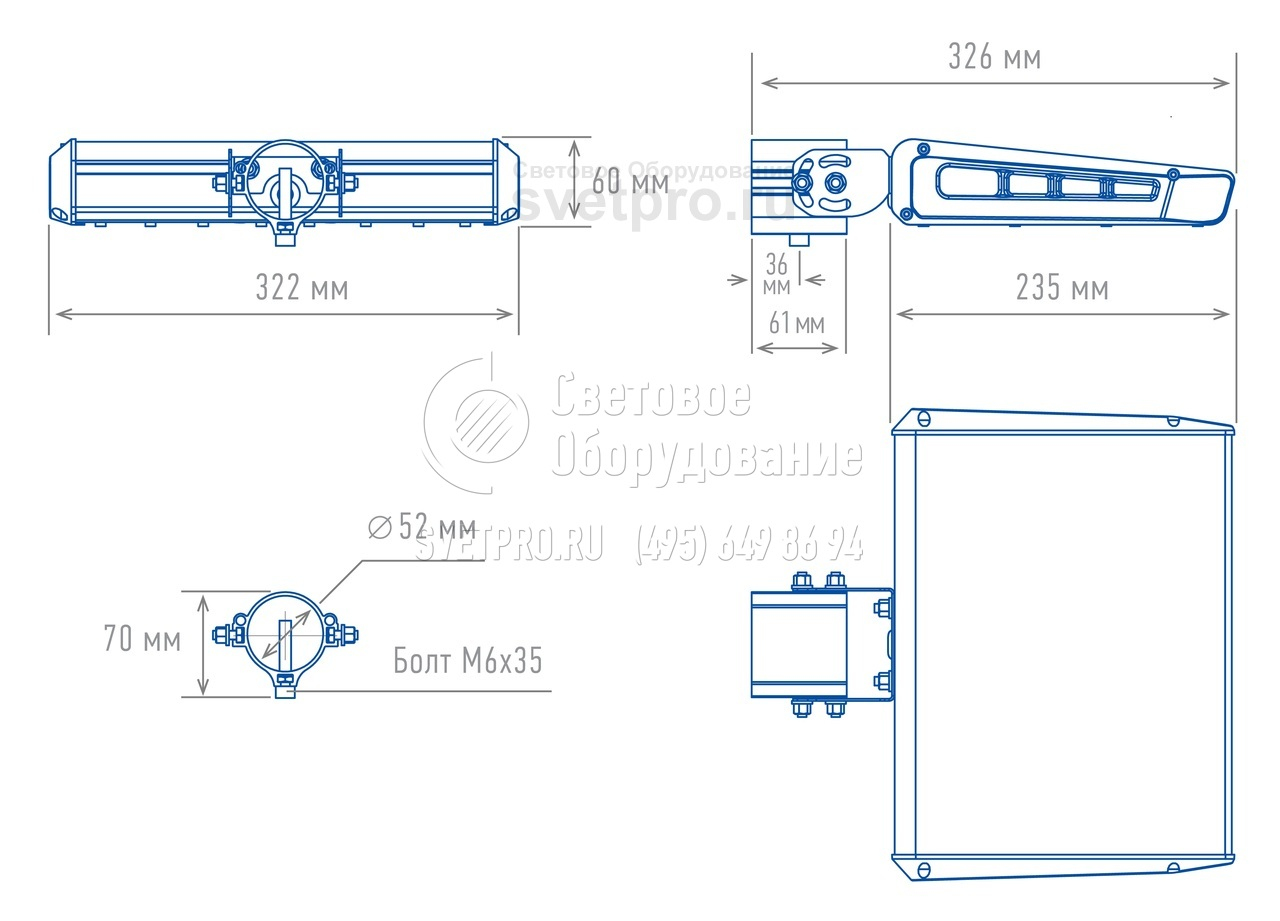 | Способ крепления светильника: | Кронштейн консоль Ø30mm - Ø52mm регулируемый +65° / -65° |