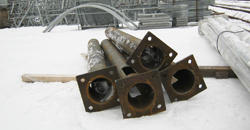 - С двумя фланцами. В этом случае нижняя опорная площадка крепится на трубчатую закладную деталь фундамента. Вынесенный по горизонтали фланец используется для закрепления наземной части опоры.