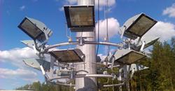 Световые приборы на оголовке опоры со спускаемой короной можно установить по окружности или с одной стороны. Так мачта адаптируется для заливающего или направленного освещения.